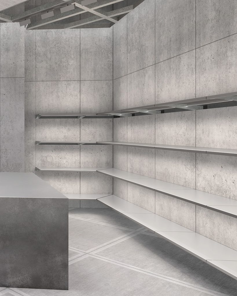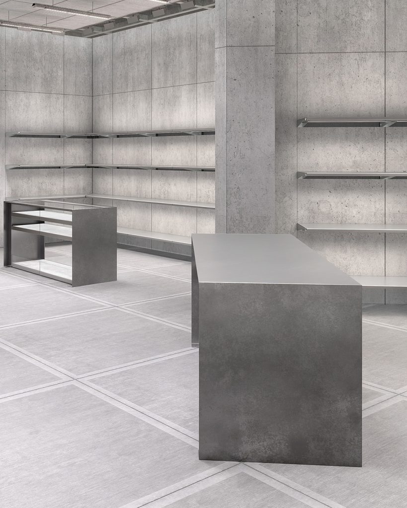 ภายในสโตร์มีการผสมผสานของพื้นผิวที่หลากหลายอย่างมีมิติ ไม่ว่าจะเป็นผนังที่ถูกตกแต่งด้วยแผงวัสดุต่างๆ พื้นกระเบื้องคอนกรีตขัดมัน และเผยโครงสร้างเปลือยให้บรรยากาศแบบปูนดิบ ซึ่งให้บรรยากาศแบบยูทิลิทาเรี่ยนตัดด้วยที่นั่งหนังเนื้อนุ่มพร้อมด้วยพรมที่เน้นผิวสัมผัสเป็นพิเศษ กระจกรมควันและราวเหล็กแขวนเสื้อผ้าที่ห้อยลงมาจากเพดาน ผสานกับโต๊ะโลหะดิบและชั้นวางอะลูมิเนียมรีดขึ้นรูป ช่วยเติมกลิ่นอายของความเป็นอุตสาหกรรมให้กับพื้นที่อย่างลงตัว