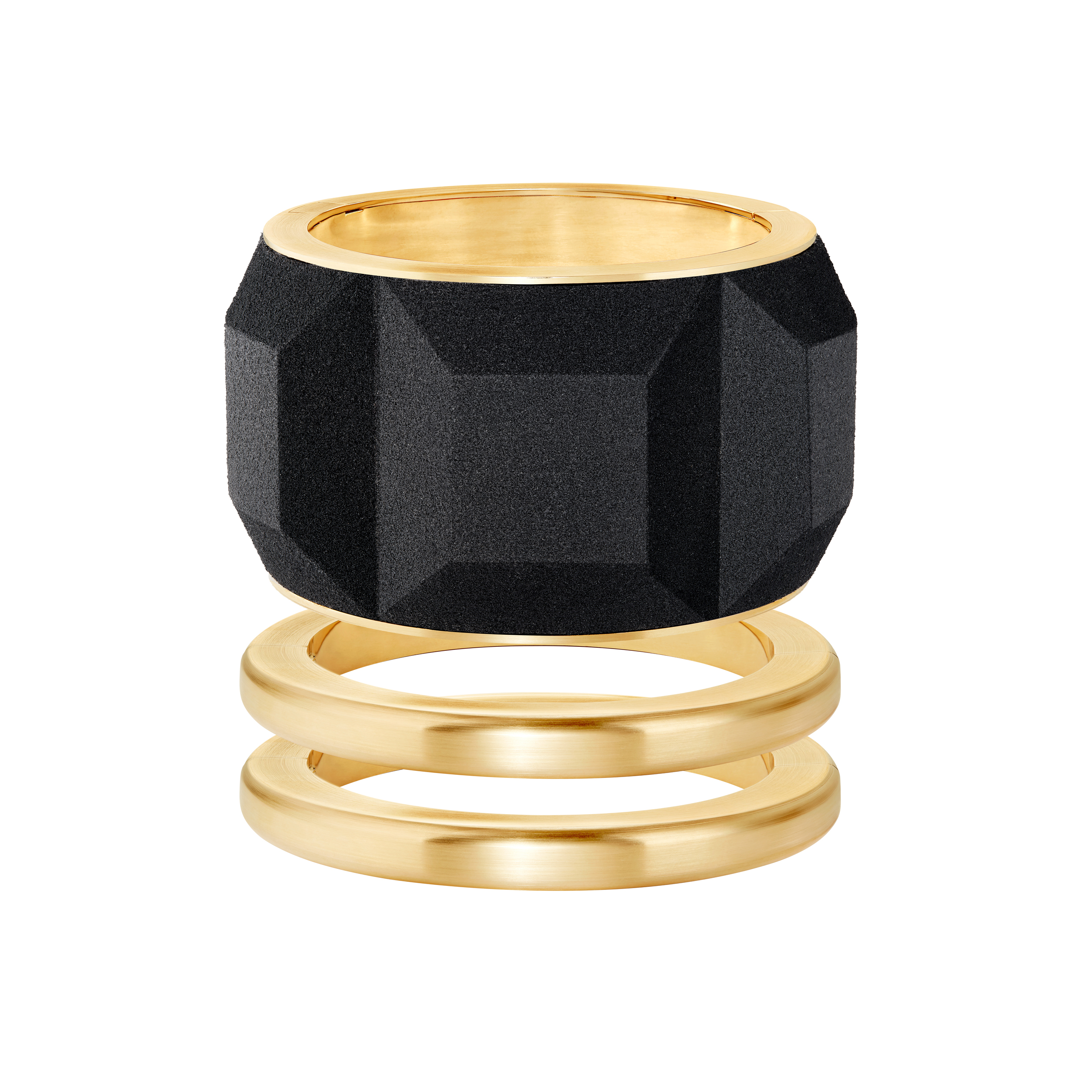 การสร้างสรรค์ผลงานแต่ละชิ้นล้วนเต็มไปด้วยความท้าทายทางเทคนิค โดยสตูดิโอออกแบบเริ่มจากการนำเทคโนโลยีการจำลองแบบสามมิติมาใช้เพื่อให้ได้สัดส่วนขนาดใหญ่ตามที่ต้องการ พร้อมคงรายละเอียดอันเฉียบคมของลวดลาย Clou de Paris ซึ่งเป็นเอกลักษณ์ของ Quatre ได้อย่างแม่นยำ จากนั้นจึงขึ้นรูปทรายสีดำด้วยเทคโนโลยีการพิมพ์แบบสามมิติ ก่อนนำไปประกอบเข้ากับโครงสร้างหลักของกำไลทองคำ การขัดเงาด้านในและปัดด้านส่วนริมขอบขับเน้นการเล่นกับพื้นผิวและแสงเงาอย่างงดงาม ในขณะที่การเคลือบแบบพิเศษช่วยคงสีของทรายไว้อย่างสมบูรณ์แบบ สุดท้ายนี้กลไกตัวล็อกของกำไลคือบทพิสูจน์แห่งความเชี่ยวชาญทางด้านเทคนิคของเมซงด้วยรายละเอียดการออกแบบอย่างประณีตทำให้กลมกลืนไปกับเส้นสายอันบริสุทธิ์และทรงพลังของงานดีไซน์
