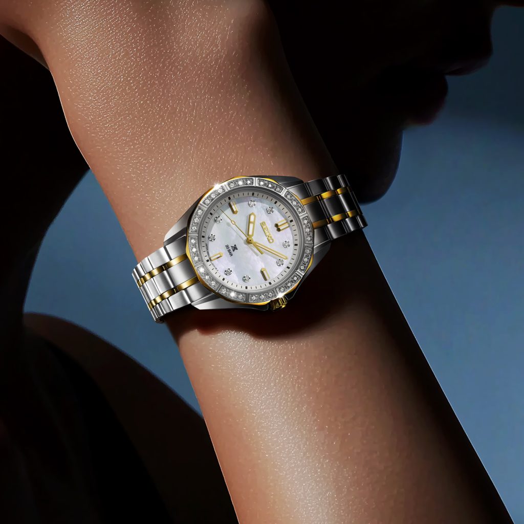 ปิดท้ายด้วยเรือน Masterpiece ของซีรีส์นี้ กับการจัดเต็มทุกองค์ประกอบของความหรูหรา และสวยงาม จุดเด่นที่สะกดดวงตาทุกคู่ให้จับจ้อง กับการประดับเพชร 8 เม็ด บนหลักชั่วโมง และล้อมรอบด้วยเพชรอีกจำนวน 36 เม็ด บนขอบตัวเรือน รวมน้ำหนักเพชรทั้งหมดที่มากถึง 0.2177 กะรัต และยกระดับเรือนนี้ให้ Luxury ขั้นสุด ด้วยหน้าปัดมุก MOP (Mother of pearl) และส่งท้ายให้เรือนนี้ Flawless ไร้ที่ติ ด้วยการเคลือบ Gold IP-Coating บนหลักชั่วโมง ชุดเข็ม ขอบตัวเรือน เม็ดมะยม และสายข้อกลาง