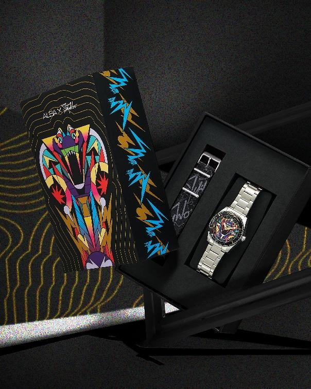 ALBA x Tikkywow Limited Edition: The King Kobura ถูกออกแบบให้สะท้อน ลักษณะเด่นของงูเห่า ด้วย สีสันจัดจ้านสไตล์ Japanese City-pop และ ลายเส้นเฉพาะตัวของ Tikkywow สอดคล้องกับแท็กไลน์ของแบรนด์ ‘The Reflection of Japan’ ทำให้นาฬิกาเรือนนี้ทั้ง สนุก ตื่นเต้น และน่าค้นหา ในเวลาเดียวกัน