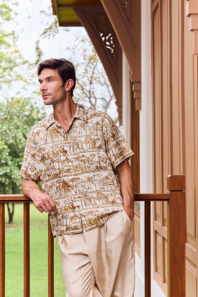 โดยเป้าหมายหลักคือการพาผู้สวมใส่ย้อนกลับไปสัมผัสจินตนาการในช่วงเวลาที่ ‘จิม ทอมป์สัน’ เดินทางมาถึงประเทศไทยและได้สัมผัสจิตวิญญาณปีใหม่ไทยเป็นครั้งแรก เรื่องราวในคอลเลกชั่นนี้ร้อยเรียงผ่านลวดลายพิมพ์วิจิตรที่เป็นหัวใจสำคัญอย่างลาย Woodland Voyage ที่นำภาพจิตรกรรมฝาผนังจากวัดในภาคอีสานเรื่อง ‘สินไซ’ มาตีความใหม่ให้ดูสง่างามทว่าแฝงความสนุกสนาน ผสมผสานกับลาย ONSON ที่สะท้อนวิถีชีวิตแบบมินิมัลผ่านเสน่ห์ศิลปะพื้นบ้าน และลาย LEELA ที่สื่อถึงความอ่อนช้อยของดอกกล้วยไม้ท่ามกลางป่าไผ่ นอกจากนี้ยังมีลายพิมพ์ที่มอบพลังความสดใสอย่าง PALM FIELD ที่นำเสนอต้นปาล์มเต้นระบำ และลาย NATEE ที่ได้รับแรงบันดาลใจจากการเคลื่อนไหวของระลอกคลื่น ช่วยเติมเต็มเรื่องราวของคอลเลกชันให้สมบูรณ์ยิ่งขึ้น