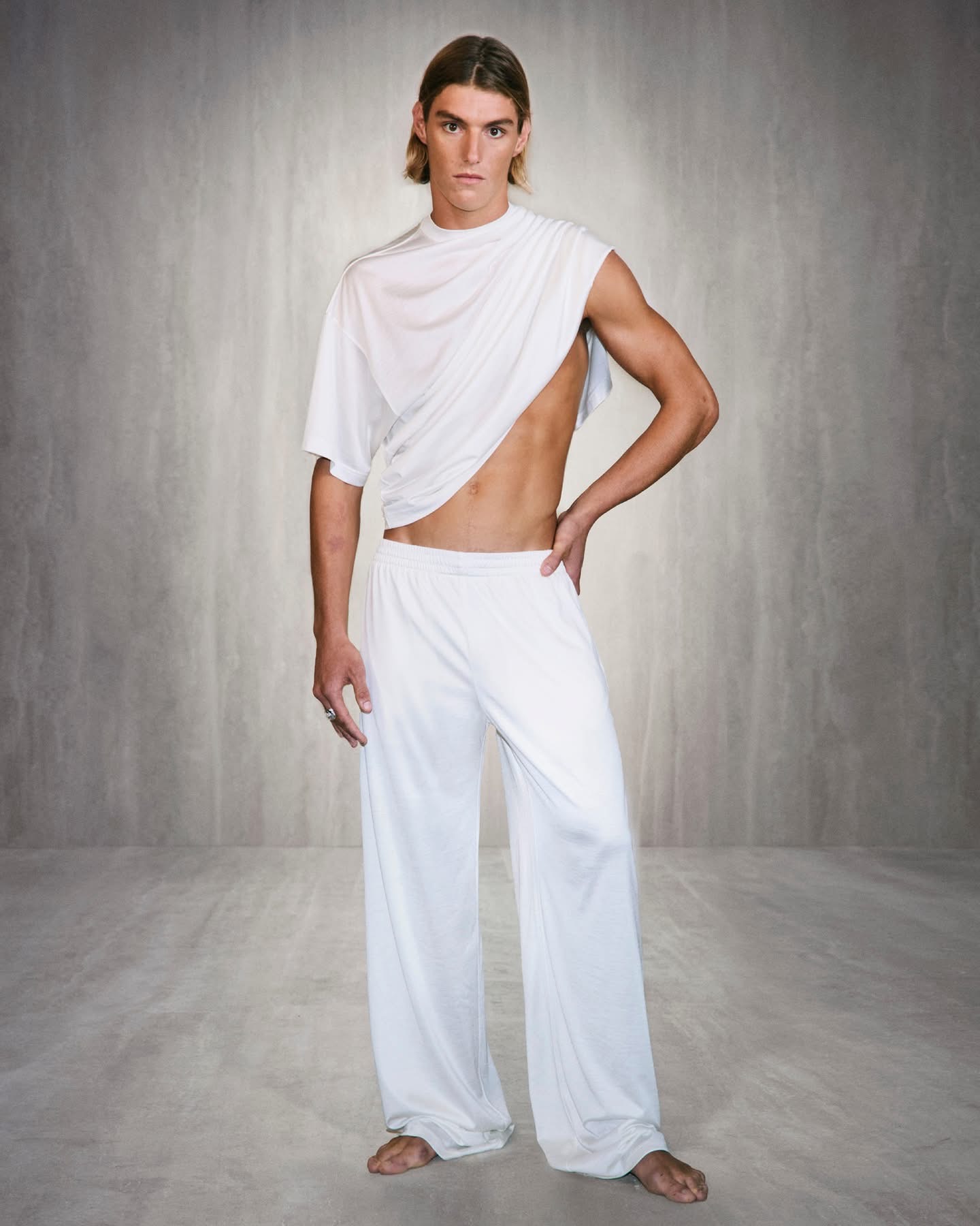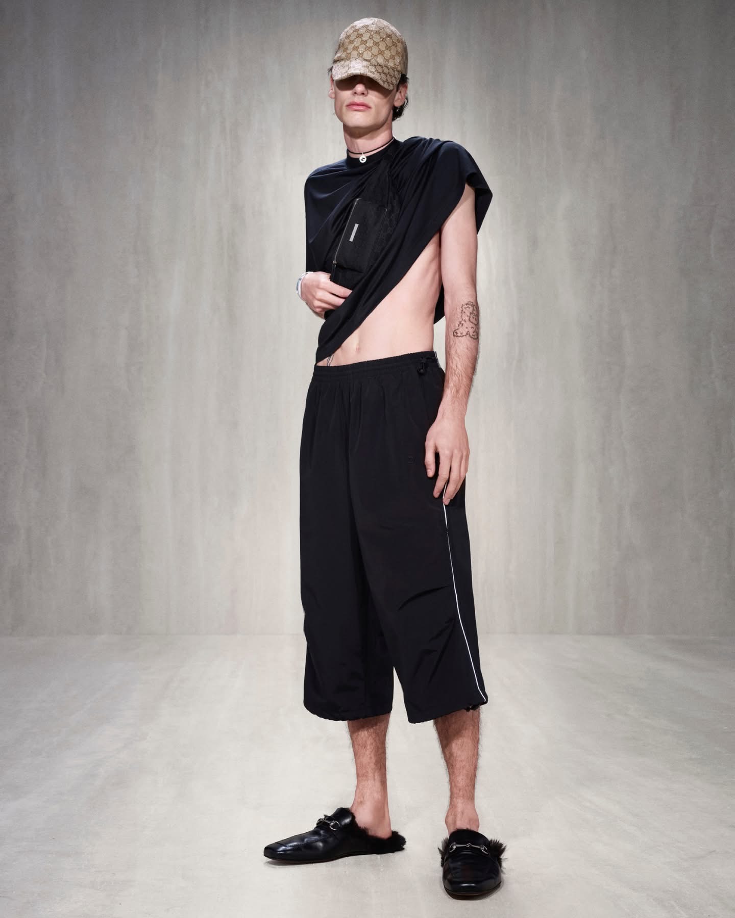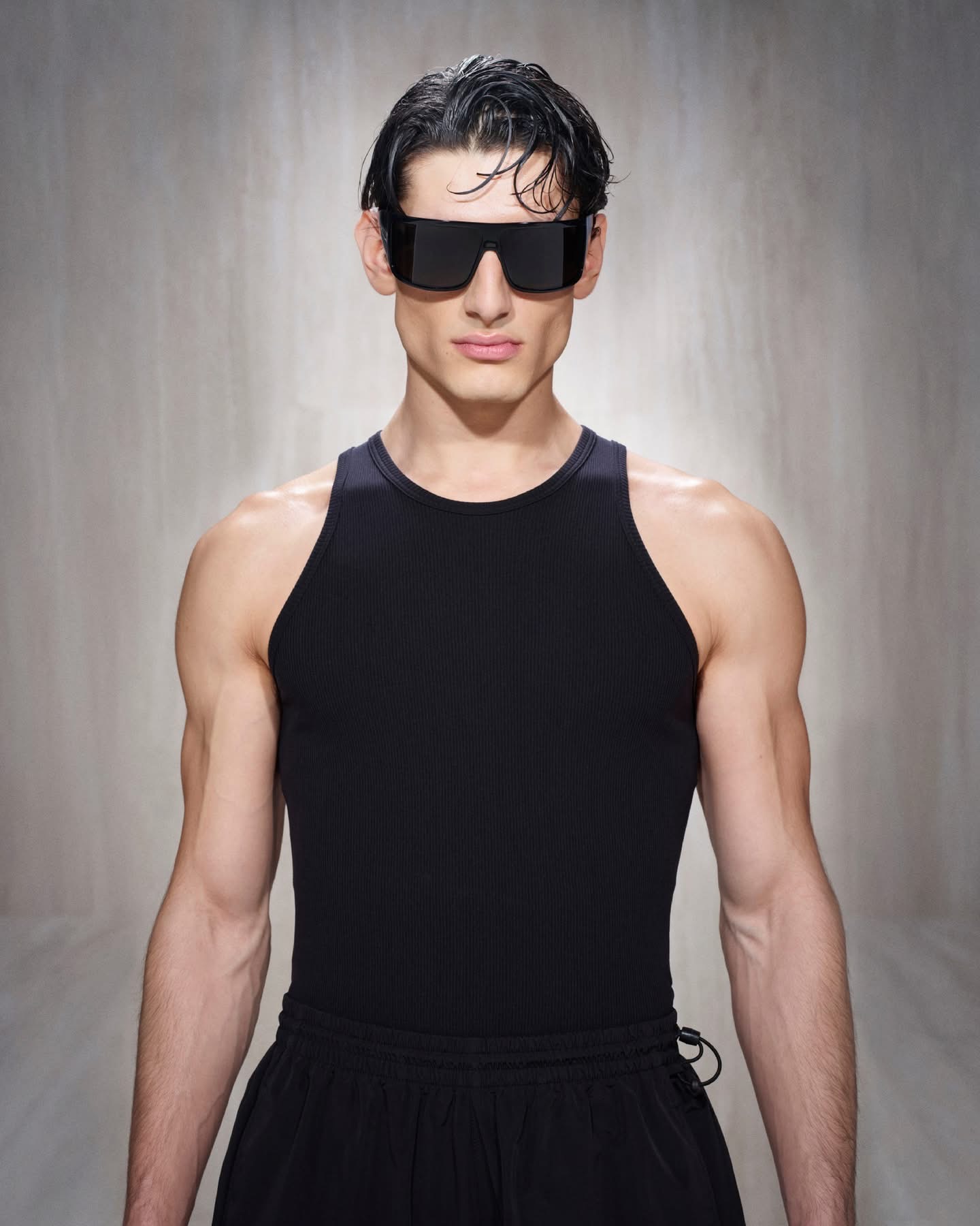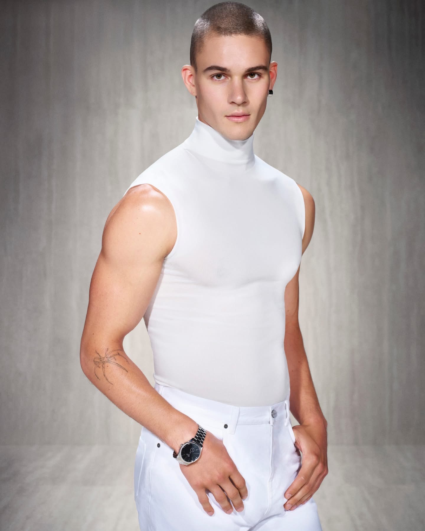 ผลงานของเขาชัดเจนมากในการโฟกัสไปที่ ‘ผู้สวมใส่’ ไม่ใช่แค่เสื้อผ้า เสื้อผ้ากลายเป็นเครื่องมือที่ช่วยขยายมุมมอง เสริมทัศนคติ และเปิดพื้นที่ให้แต่ละคนได้นิยามตัวตนของตัวเองใหม่อีกครั้ง หลายลุคในคอลเลกชั่น โดยเฉพาะเสื้อผ้าท่อนบนและไอเท็มแนวกีฬาอย่างเสื้อรัดรูป ถูกนำมาตีความใหม่ผ่านเลนส์ของมินิมัลลิสม์แบบยุค 90s ที่ให้ความบริสุทธิ์ของเส้นสายที่ถูกลดทอนจนเหลือเพียงแก่นสำคัญที่โครงเสื้อ แต่ภายใต้ความเรียบง่ายที่เห็นนั้น กลับซ่อนเทคนิคที่ลึกและเฉียบคม ตั้งแต่การพัฒนาแพทเทิร์นเพื่อลดจำนวนตะเข็บให้น้อยที่สุด ไปจนถึงการใช้ความร้อนในการเก็บรายละเอียดของชายผ้า จนถึงเนื้อผ้าเส้นใยที่เลือกใช้อย่างเส้นใยยืดที่มักถูกใช้ในการทำถุงน่อง ถูกทอให้หนาขึ้นและใช้สำหรับการทำเสื้อ ทุกองค์ประกอบทำงานร่วมกันอย่างแนบเนียน จนเสื้อผ้าสามารถโอบรับสรีระได้อย่างสมบูรณ์แบบ ราวกับถูกหล่อขึ้นมาเพื่อร่างกายนั้นโดยเฉพาะ