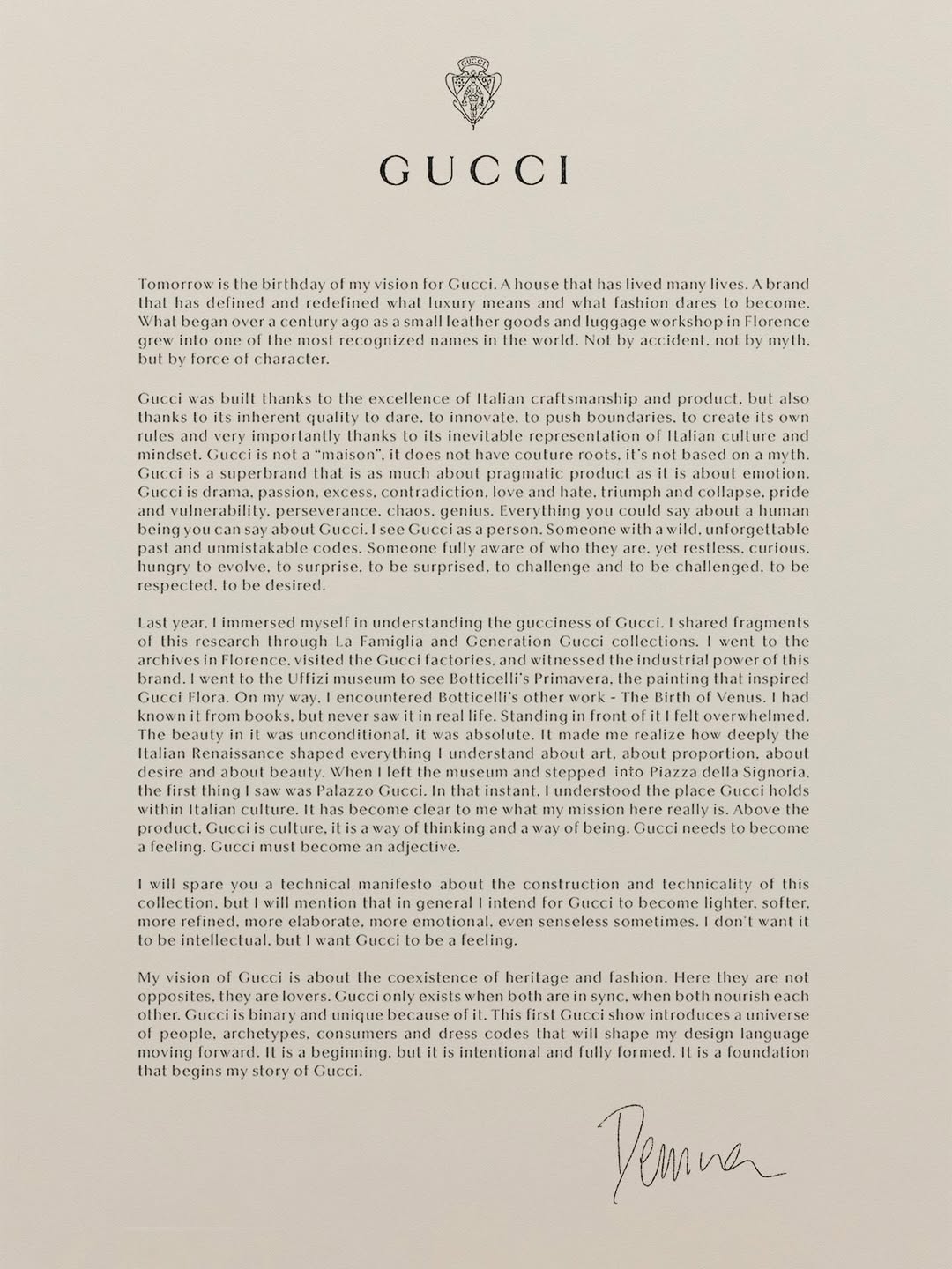 Gucci คอลเลกชั่น Primavera โดย เดมนา มอบความคิดให้กับผมว่าแฟชั่นไม่ใช่ของฟุ่มเฟือย และไม่จำเป็นต้องซับซ้อนเพื่อพิสูจน์คุณค่า มันคือสิ่งที่เราสามารถ ‘รู้สึก’ และ ‘ใช้’ ได้ในชีวิตจริง เป็นเครื่องมือในการสื่อสาร เป็นพื้นที่ของอิสรภาพทั้งทางด้านความคิดและการแสดงออก และเหนือสิ่งอื่นใด มันทำให้เรา ‘รู้สึก -ดี- ที่ได้เป็นตัวของตัวเอง ในแบบที่เราเลือกเอง’ Live and let live.