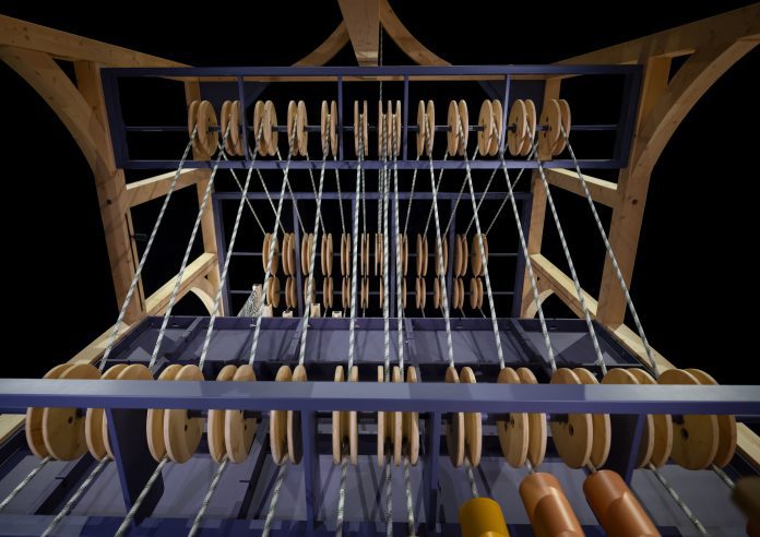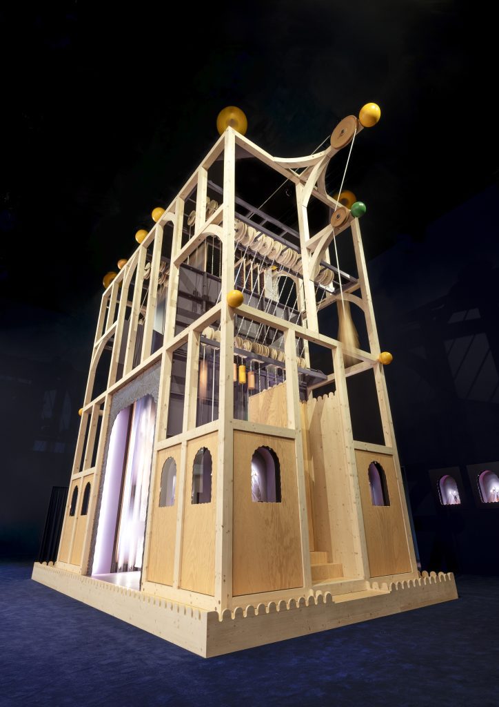 การจัดวางพื้นที่เน้นความขัดแย้งของแสงและเงาอย่างมีมิติ ชวนให้สายตาของผู้มาเยือนต้องสำรวจลึกเข้าไปในโครงสร้างไม้ที่เชื่อมโยงกันด้วยเชือกและรอกไม้ซึ่งขับเคลื่อนไปตามจังหวะที่กำหนดไว้อย่างแม่นยำ ราวกับว่ากำลังยืนอยู่ในหัวใจของเครื่องจักรเวลาขนาดใหญ่ที่มีเสียงกระทบของวัสดุสร้างท่วงทำนองอันเป็นเอกลักษณ์