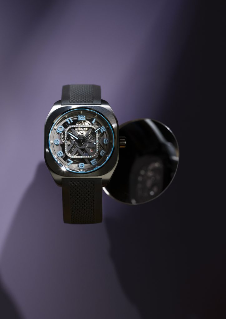 ไฮไลต์ที่สุภาพบุรุษนักสะสมนาฬิกาไม่ควรพลาดในปีนี้คือการมุ่งเน้นไปที่ศิลปะแบบ Squelette หรือการฉลุโปร่งที่เผยให้เห็นความแข็งแกร่งของกลไกภายในอย่างชัดเจน นำโดยรุ่นยอดนิยมอย่าง Hermès H08 Squelette ที่มาในลุคสปอร์ตหรูพร้อมรายละเอียดกลไกที่ซับซ้อน Arceau Samarcande ที่นำความคลาสสิกมาตีความใหม่ผ่านโครงสร้างโปร่งตา และ Slim d’Hermès Squelette Lune ที่โดดเด่นด้วยฟังก์ชันข้างขึ้นข้างแรมบนดีไซน์เพรียวบาง โดยเรือนเวลาแต่ละรุ่นถูกจัดแสดงอยู่ในช่องผนังเสมือนโรงละครขนาดเล็กที่เปิดหน้าต่างให้เราได้มองทะลุเข้าไปถึงปริศนาของเข็มนาฬิกาและฟันเฟืองที่ทำงานร่วมกันอย่างไร้ที่ติ