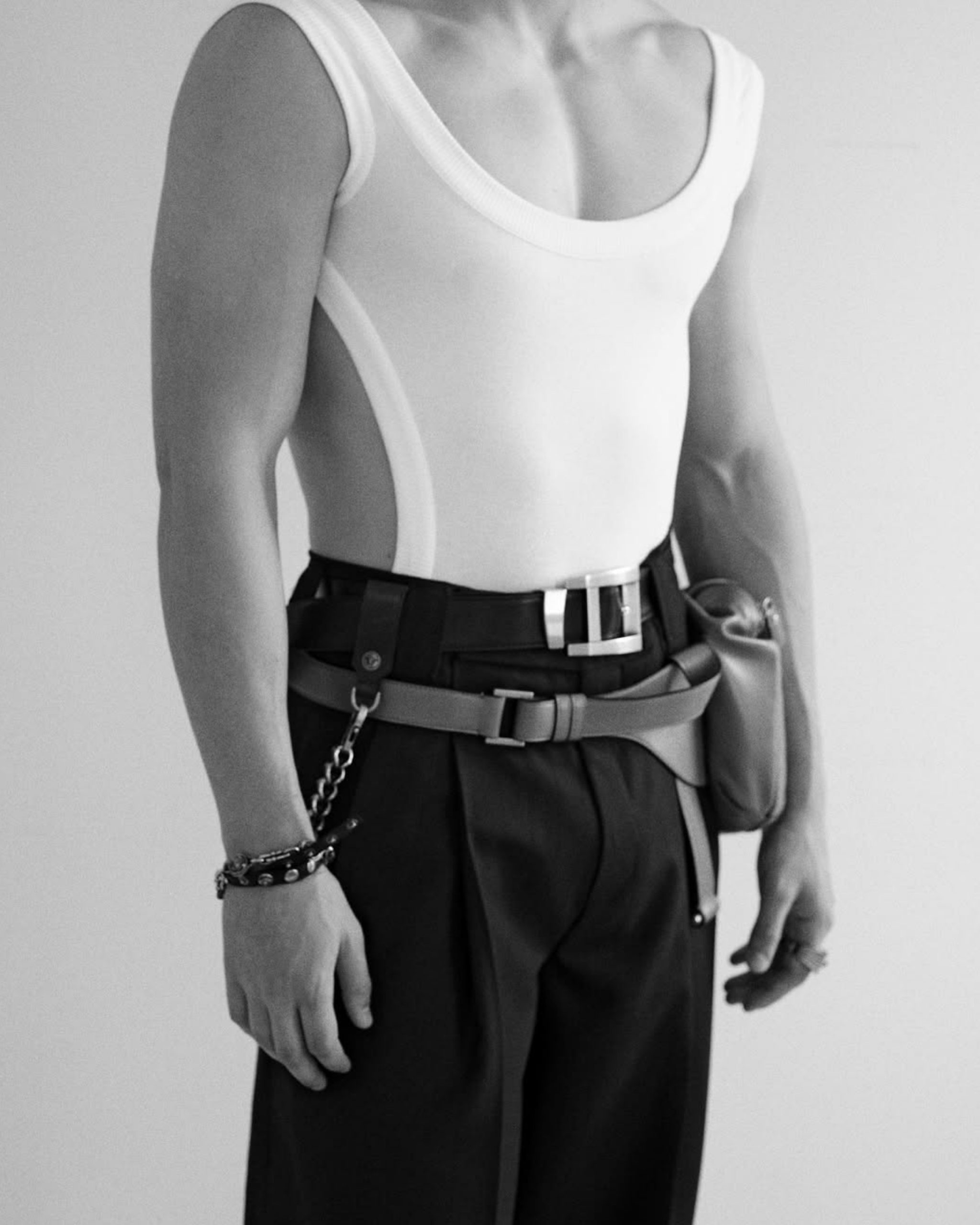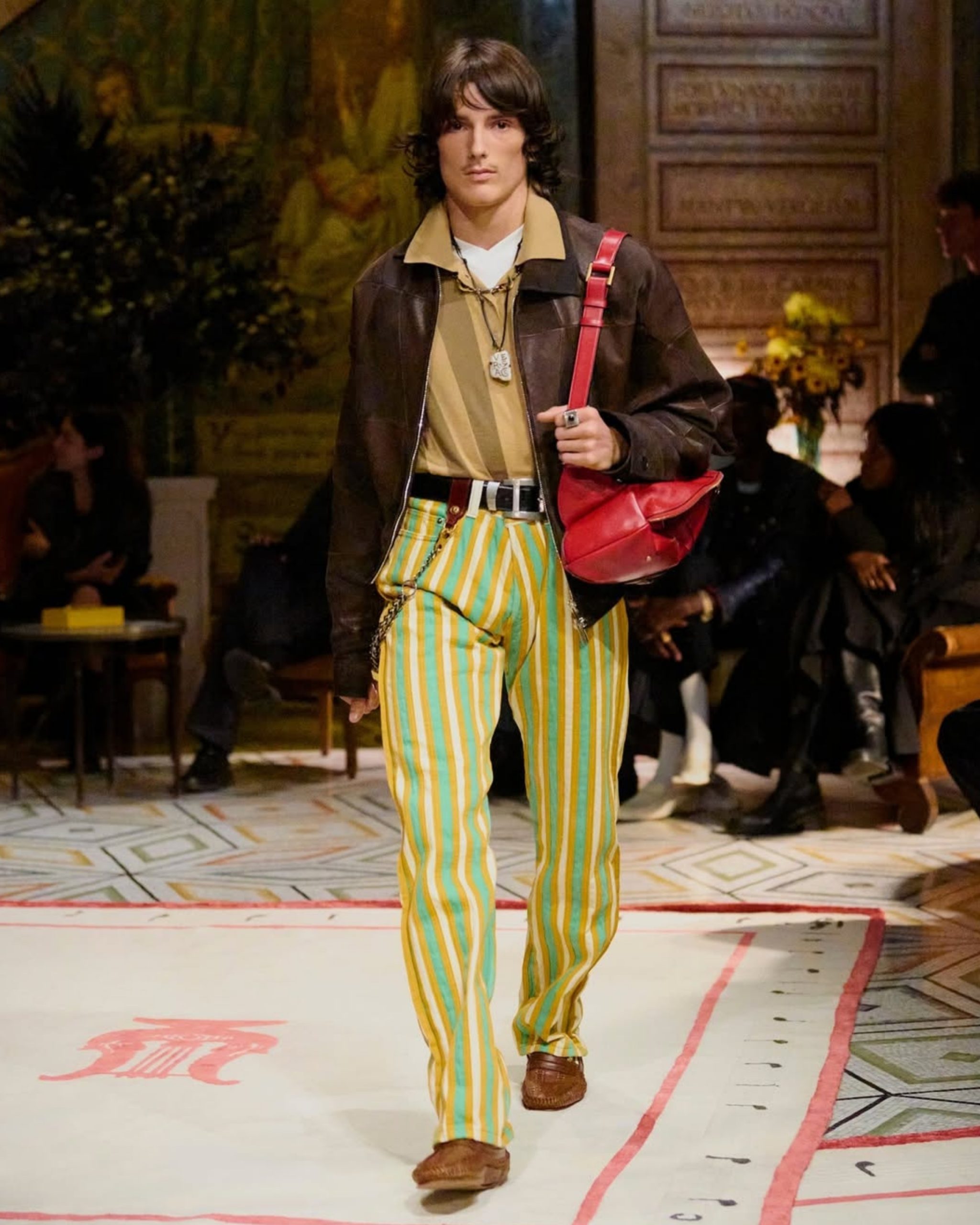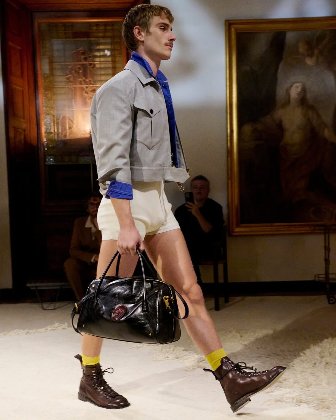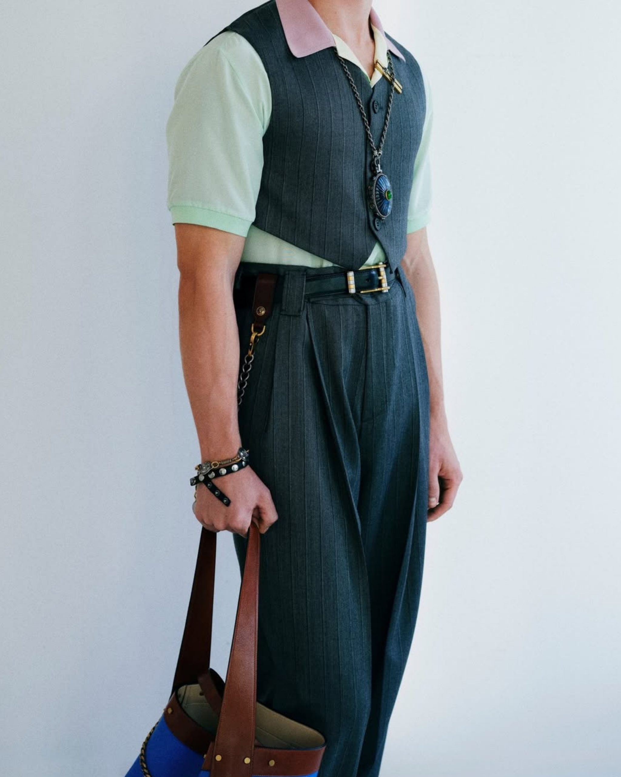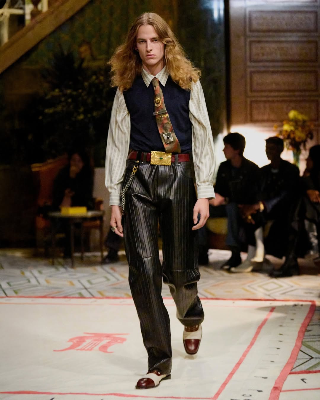 เสื้อกล้ามเว้าลึกใส่กับกางเกงขายาวทรงกระบอกตรงในสีสันจัดจ้าน และที่โดดเด่นคือไอเท็มอย่างแจ็กเก็ตและเสื้อเชิ้ตหนังเนื้อนุ่มที่โชว์ทักษะงานฝีมือขั้นสูงที่ให้กลิ่นอายแบบเวสต์เทิร์น